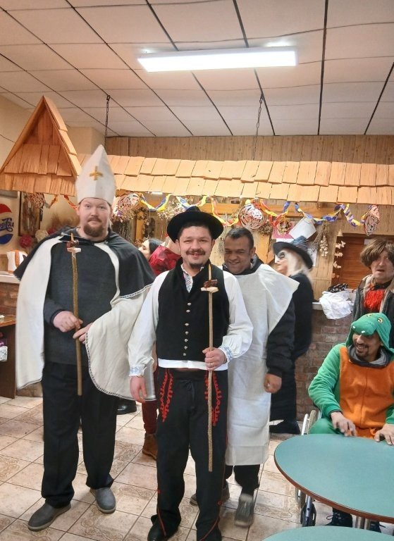 Fašiangy sú obdobím od Troch kráľov až do Popolcovej stredy, po fašiangoch nasleduje 40 dňový pôst až do Veľkého noci. Je to dosť dlhé obdobie kedy sa nebudeme môcť veseliť a tak sme dňa 17.02.2026 tento tradičný sviatok oslávili ako sa patrí. Prijímatelia sociálnej služby si poctivo pripravovali a vyberali masky, ku ktorým každý rok pribudne zopár nových a nápaditých masiek vytvorených prijímateľmi sociálnej služby spolu s inštruktormi sociálnej rehabilitácie a sociálnymi pracovníkmi.