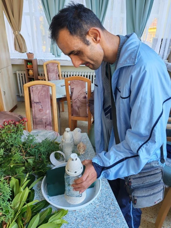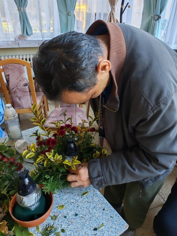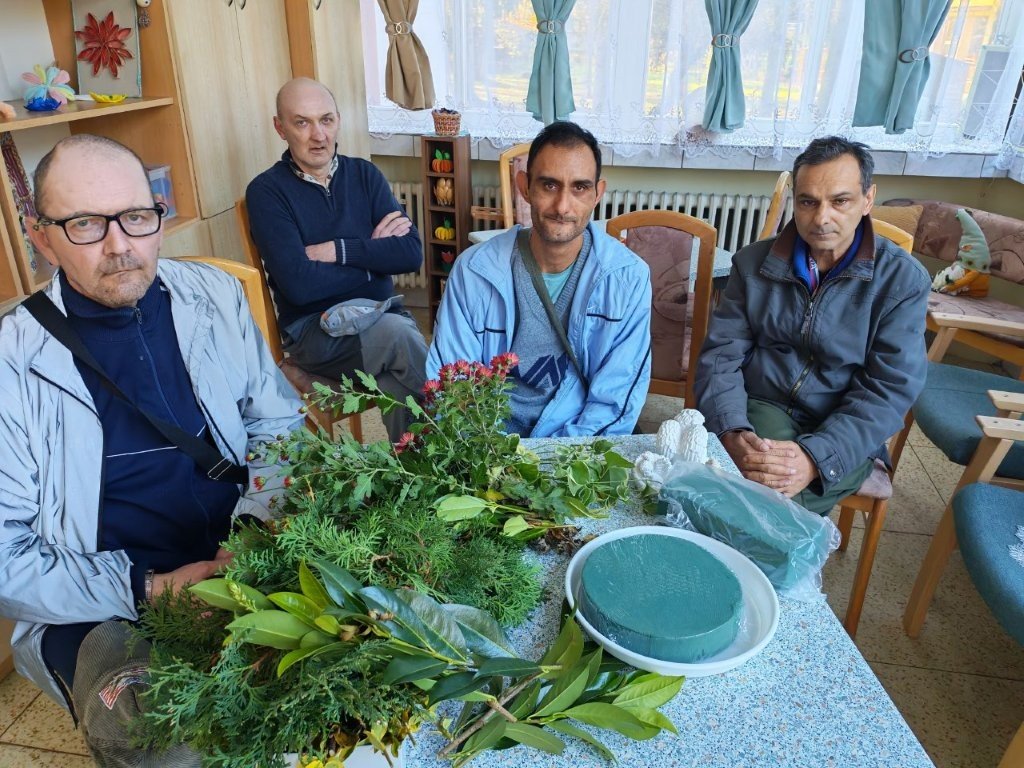 Prijímatelia sociálnych služieb sa s láskou a trpezlivosťou pustili do tvorenia dušičkových dekorácií z prírodných materiálov - čečiny, ozdobných krov a sviečok. Aranžmány sme doplnili o malé sošky, ktoré prijímatelia počas uplynulého týždňa vlastnoručne odlievali-každá z nich bola originálna a niesla osobný odkaz, či symbol spomienky.